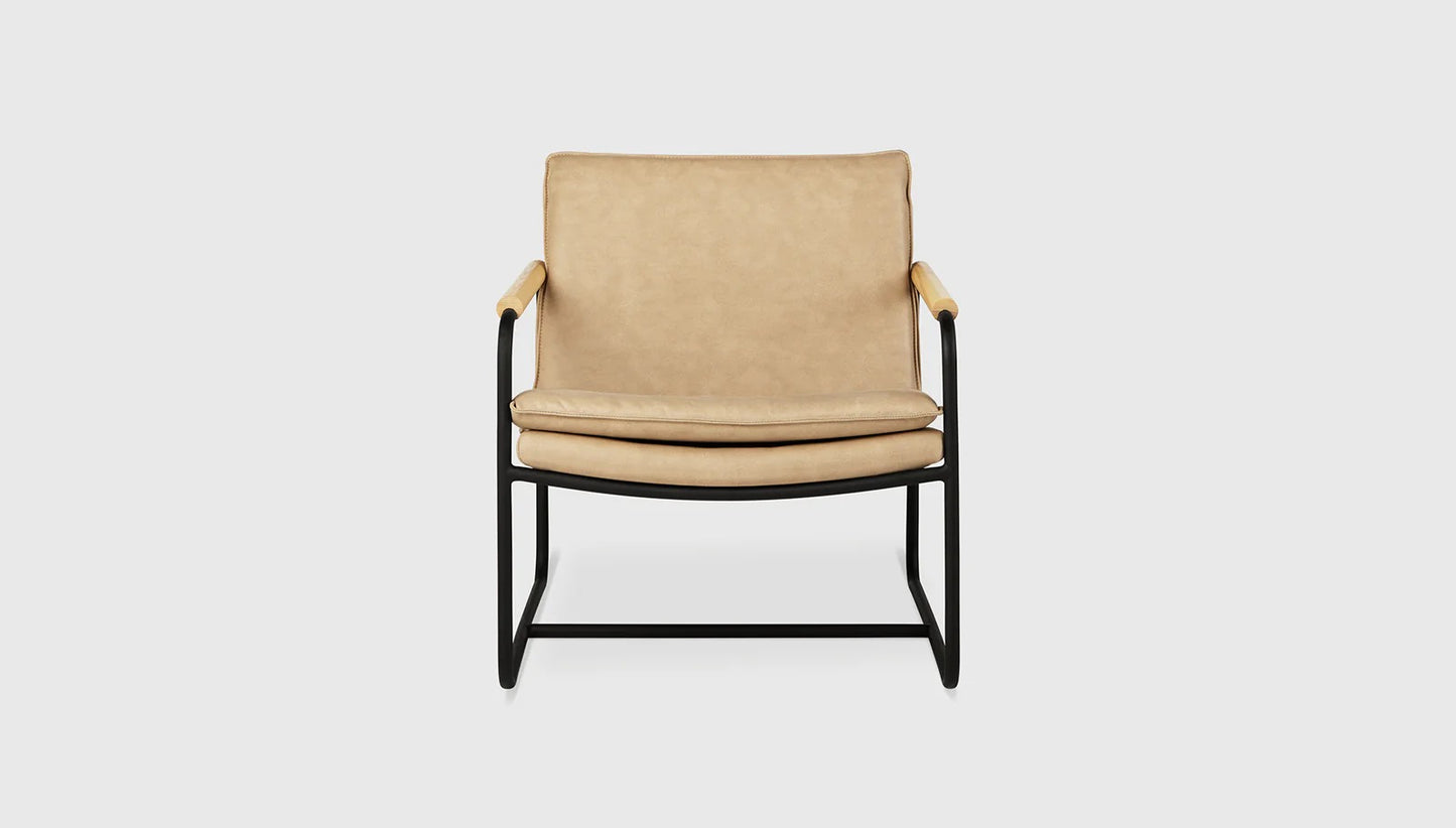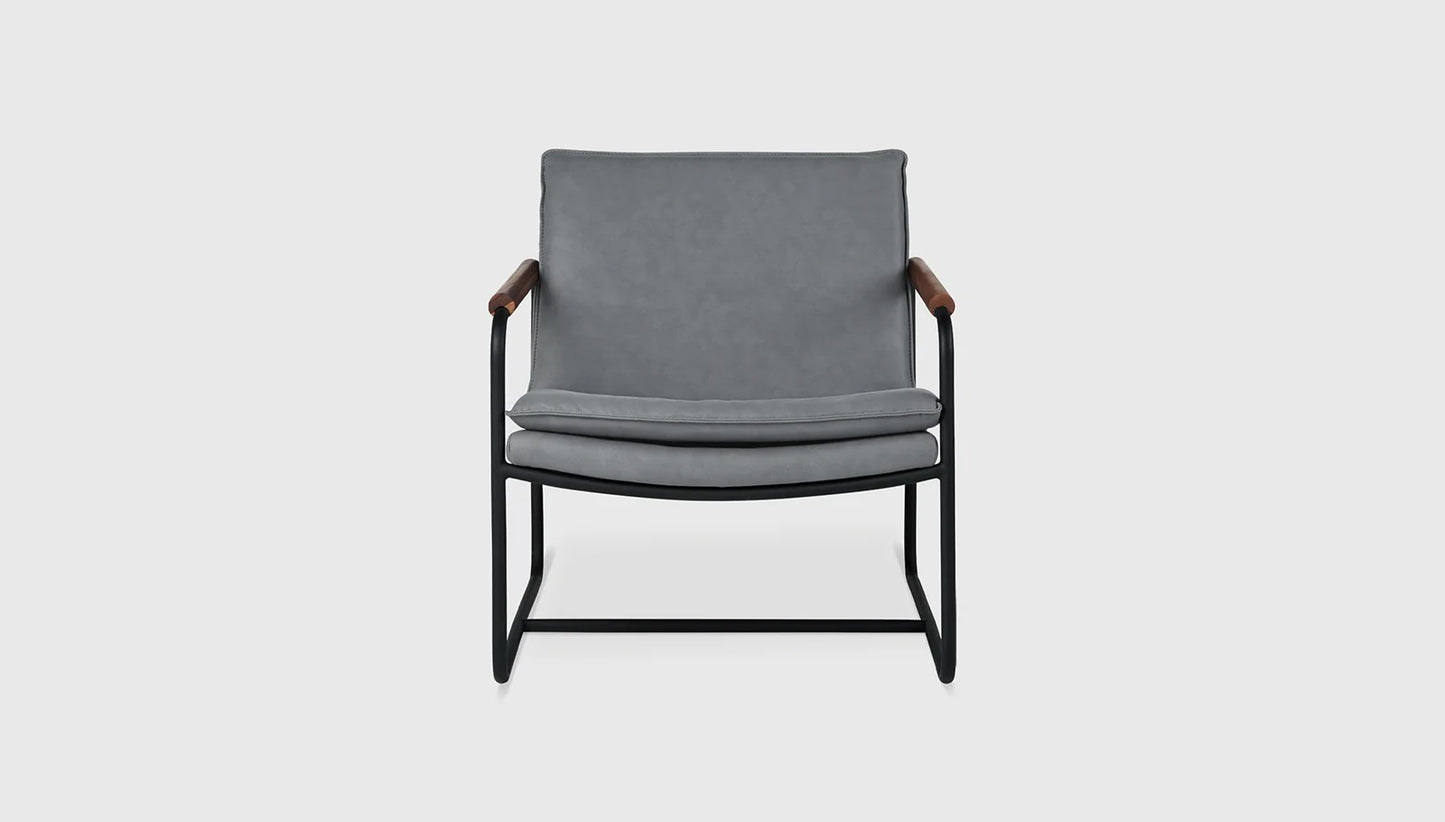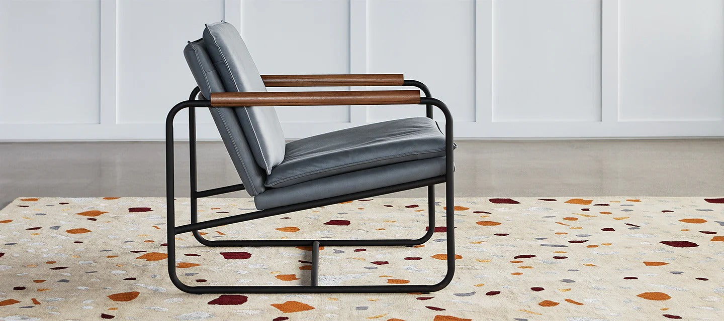 - Bench‐made, powder‐coated solid steel, sled base frame with solid FSC®‐Certified Ash or Walnut arm detailing.