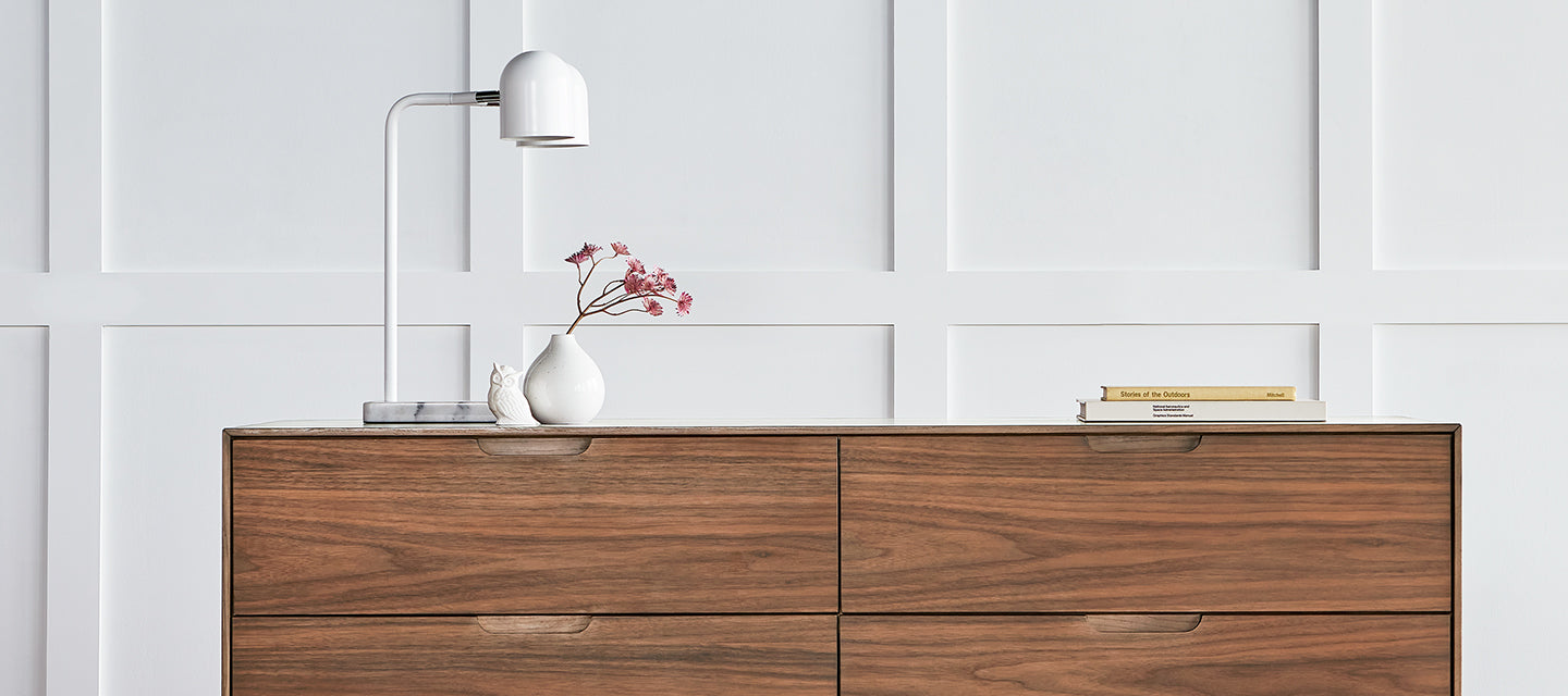 Soft close drawers feature recessed finger pulls and solid wood detailing on top edge.