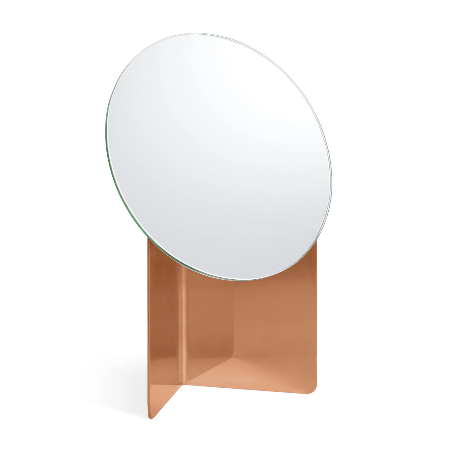 Take a good long look. A simple round mirror sits atop an angled steel base that flaunts flashy finishes and guarantees you’ll always like what you see.